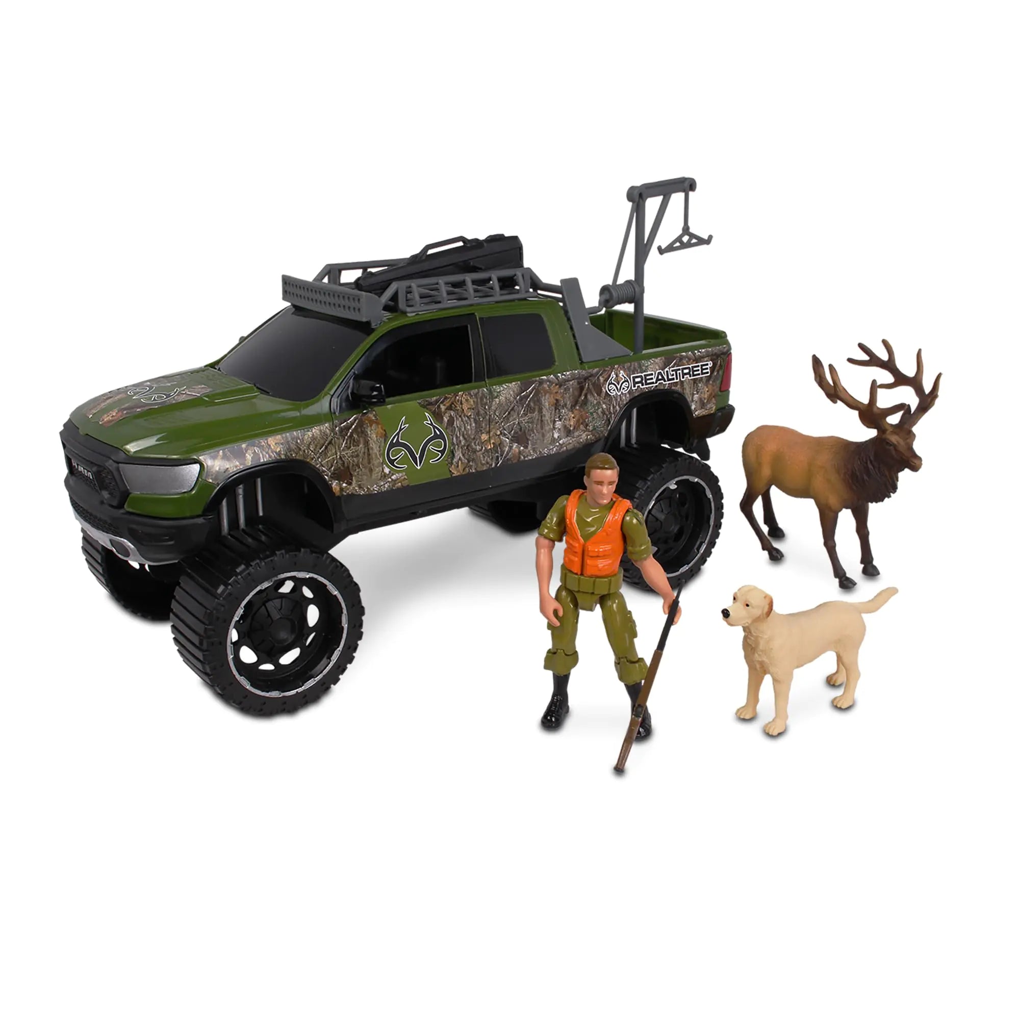 21831 Realtree Ram 1500 Rebel 8pc Set An entire Realtree universe centers around this legendary 4" tall Hunter. This fully articulated figurine is strapped with a rifle. Every rifle deserves a rifle case (which is the case here). The hunter also comes with an officially licensed and detailed Ram 1500 Rebel which sports a roll bar roof rack and even a game hoist. The doors on the truck open the tailgate opens and it features high quality high definition Realtree camo. Also comes with a realistic hand painted Elk and Dog to complete any and every adventure. • Immersive 8 Piece playset: Includes an officially licensed Ram 1500 Rebel a 4” tall articulating hunter a rifle a rifle case a roll bar roof rack and game hoist a high quality hand painted elk and dog. • Officially licensed Realtree Camouflage: The Ram 1500 Rebel is decked out in the legendary Realtree EDGE camouflage. It is the one of the most iconic camouflage patterns ever created. The high definition pattern is recognized worldwide and used in this playset in the perfect places. • Articulating Hunter: The 4” Hunter has enough points of articulation to make almost any pose possible. His shoulders forearms neck hips legs and knees all move with ease to not only pose but also to express. • Officially licensed Ram 1500 Rebel: The Ram 1500 Rebel is the perfect combination of style power comfort off-road capabilities and advanced technology. This officially licensed replica has been carefully scaled down for the hunter. The doors open the truck bed opens and it features high quality high definition Realtree EDGE camo. Also includes a roll bar roof rack and game hoist.